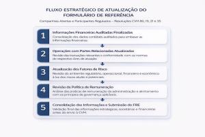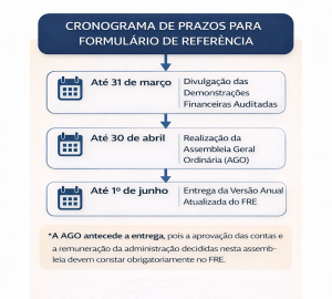 Para companhias com exercício encerrado em 31 de dezembro, o calendário habitual é submetido no exercício subsequente ao imediatamente encerrado: (i) até 31 de março a divulgação das demonstrações financeiras auditadas; (ii) até 30 de abril, a realização da Assembleia Geral Ordinária (“AGO”); (iii) até o final de maio, a entrega da versão anual atualizada do FRE. A AGO antecede a entrega, dado que determinadas deliberações desta assembleia como a aprovação das contas e a remuneração da administração devem constar obrigatoriamente no FRE.
